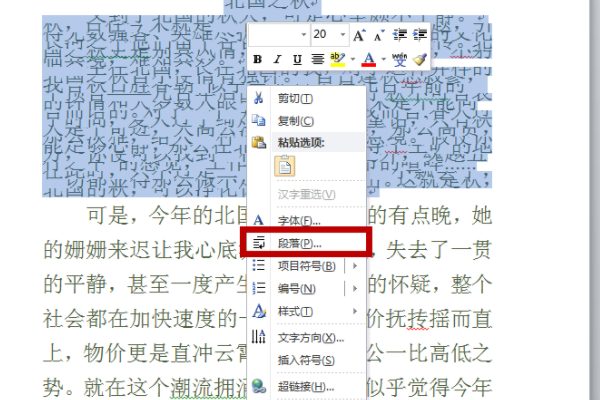 1、选择重影部分的文字,右击鼠标键,选择“段落”。