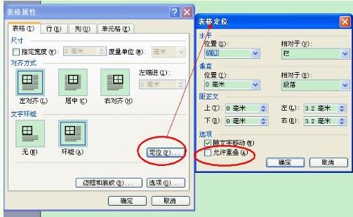 2、点击定位->表格定位,去掉"允许重叠"前的勾选;