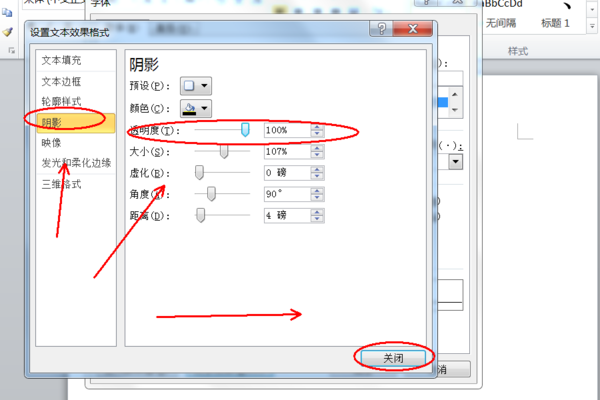 3、点击阴影标签项,在左侧把透明度调整到100%,点击关闭即可。