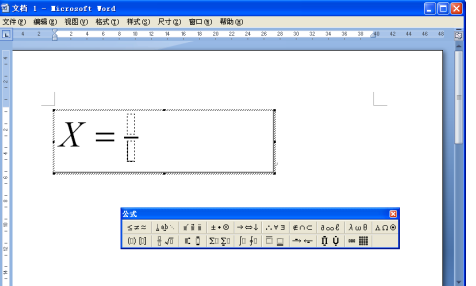 3、在公式编辑文本框中直接输入“X=”,单击“公式”工具栏中的“分式和根式模版”按钮,在弹出的菜单中单击“标准尺寸的竖分式”按钮,即可输入一个分数线,如图所示。
