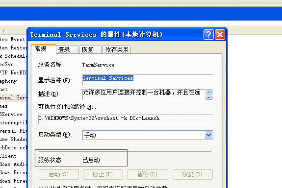 3、将上述四项的后台服务设置为启动,则3389端口就启动了。