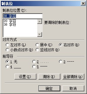 2)标号要靠右,在标尺中观察右边的位置,我这里设的是38字符左右.和上面一样,注意"对齐方式"选"右对齐",再选"设置".