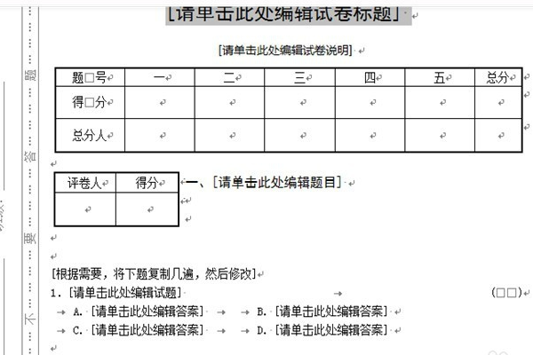 5、在空白文档中就会显示试卷模板样式了,直接输入相应的文字进行编辑就可以了,不用设置格式了。
