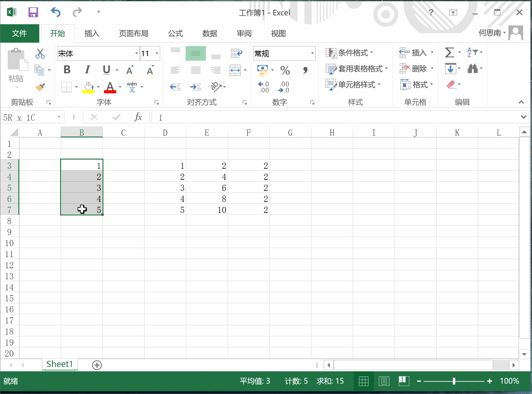 把鼠标放在B1的或下角,待其变成十字形后住下拉直到所需的数据长度,此时B列所有的数据都为8。