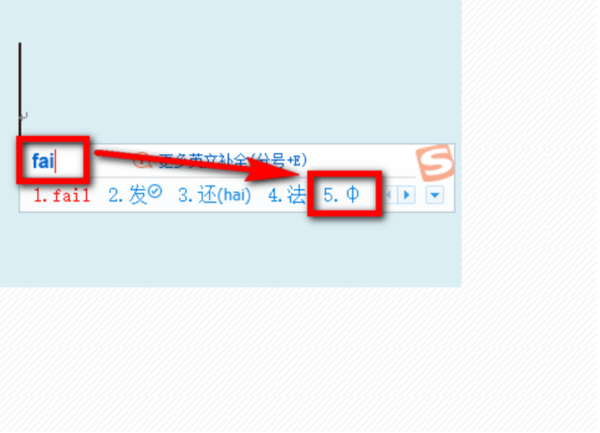 将搜狗输入法切换到中文模式,通过键盘输入拼音“fai”,这样在搜索结果中图示位置我们就能看到直径符号φ了,选择其前面的数字5即可完成输入。