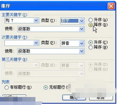 第2步,打开“排序”对话框,在“主要关键字”下拉列表中选择“列7”,“类型”选择为“数字”。然后点选“降序”单选框,并单击“确定”按钮实现排序,如图2008071256所示。