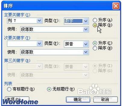 步骤五:在列表出处,选择“有标题行”(◆“有标题行”选项:对列表排序时不包括首行◆“无标题行”选项:对列表中所有行排序,包括首行)