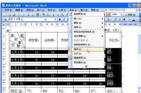 通过在Word2003表格中对数据进行排序,可以在“日汇总”表格中看出哪一天的公司接待量较大: