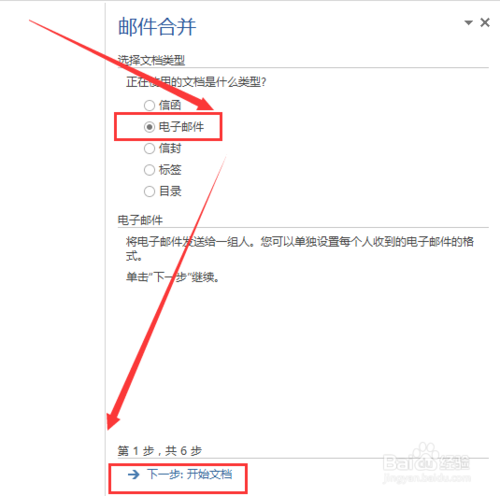 第一步,右侧,正在使用的文档是什么类型,选择电子邮件, 点击下一步。