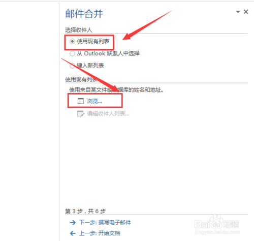 (3)出现“选择收件人”。我们选“使用现有列表”,选“浏览”,我们可以把刚才做的excel文档“11月工资表”导入进来。然后点击“下一步:撰写电子邮件”。