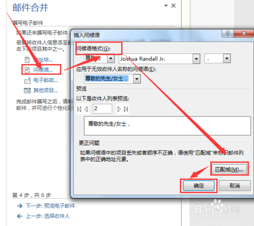 8点击“问候语”,在插入问候语中选择“问候语格式”,并检查“匹配域”为姓名匹配,最后点击确定即可,如图