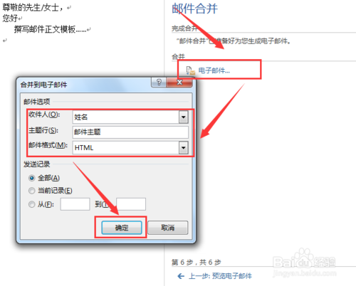 都正确,可以点下一步了。 第六步 合并邮件 点击一下电子邮件。 把主题编辑好,点确定,然后就会自动进入OUTLOOK批量发了。