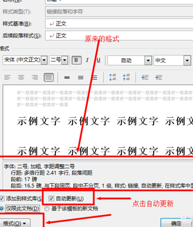 2.在弹出的菜单里头,你可以看到该标题原来的格式。为了方便你修改后的标题及时更新,点击“自动更新”。下一步就是点击“格式”,进行详细修改格式。如图所示。