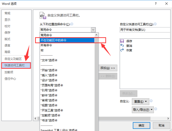 3、选中“快速访问工具栏”,在“从下列位置选择命令”列表中选择“不在功能区中的命令”。