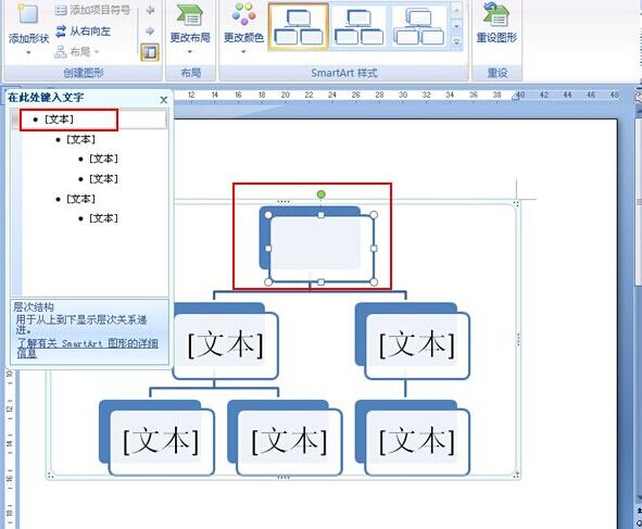 5.如图所示,已经添加了一个图形到选中的图形后面了,选择图形文本框,在其中输入文字内容,完成文字内容的输入后组织结构图就制作完成了。