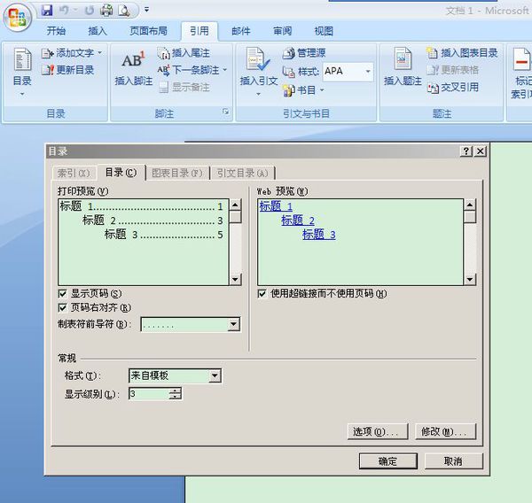 做好了标题,目录可以自动生成。空出第一页,引用工具栏第一个就是目录按钮,你可以根据下拉图示里的样式自动生成,也可以点插入目录,调出对话框进行编辑(见图)