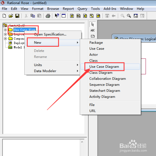 鼠标放在“use case view ”上面,单击右键,选择“new”下的“use case diagram”。