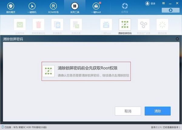 4.按照图中所示的步骤,单击使用清除锁屏密码的工具,你会发现瞬间你的设备就已经成功清除锁屏密码,既不需要重启也不会丢失资料。
