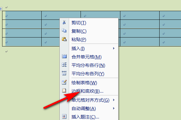 2.进入到word文档页面之后,选择表格,鼠标右键单击后选择边框和底纹进入。