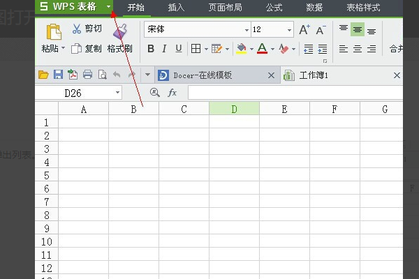 1、首先在WPS内创建一个新的文档,然后,在表格编辑窗口中找到左上角找到“WPS表格”图标后面的倒三角形并单击。