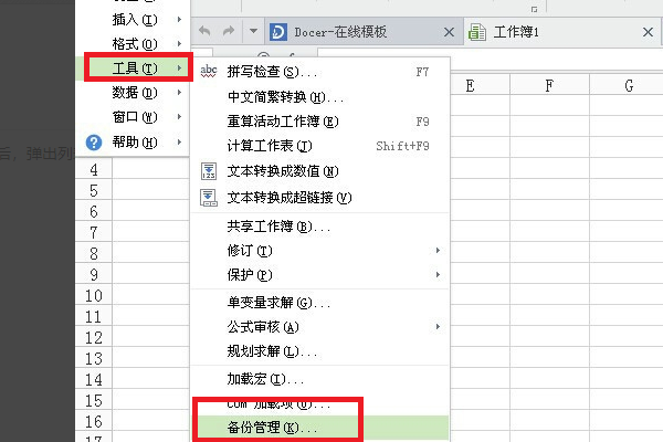 2、然后在弹出的选项界面内选择“工具”选项,再在弹出的选项栏内找到“备份管理”选项并单击。