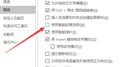 5.在“高级”选项卡栏的右侧窗格中,找到“编辑选项”区域下的“使用智能段落选择范围”选项,并将其取消勾选即可。这样就解决了word文档打开要选择合适的编码的问题了。