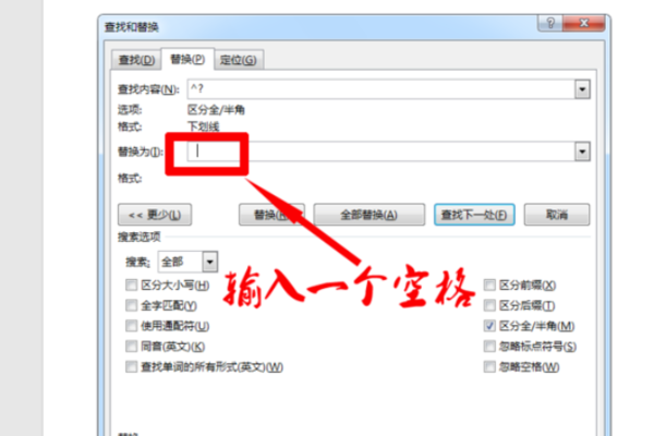 将光标移到“替换为”栏内→输入两个空格→格式→字体→选择”下划线”