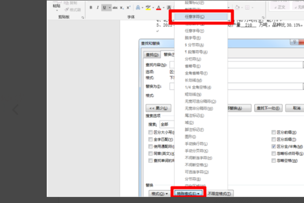六、然后,在窗口中点击“特殊格式”,选择“任意字符”。