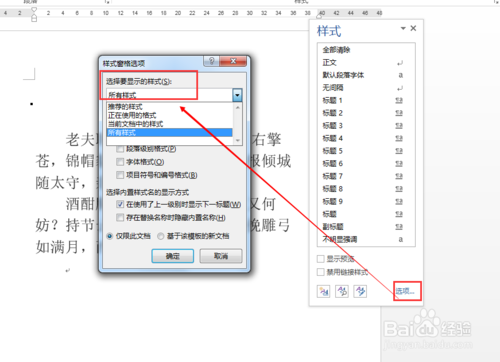 接着word界面会弹出【样式】对话框,点击【对话框】中右下方的【选项】,接着会弹出【样式窗格选项】,在【选择要显示的样式】中选择【所有样式】