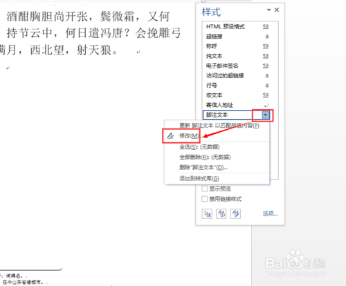 然后我们下拉【样式】对话框右边的滚动条,找到【脚注文本】选项,点击【脚注文本】右边的三角下拉按钮,这时会出现一个下拉菜单,在该菜单中选择【修改】