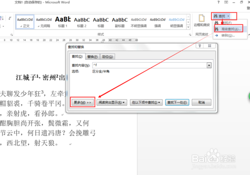 如何才能快速删除整篇文档中的脚注呢?点击【开始】选项卡,点击【查找】→【高级查找】,在【查找与替换】对话框中点击【更多】按钮