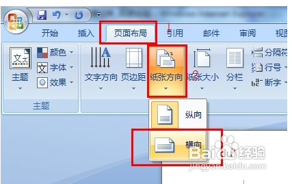 3、然后光标不动依然停在第二页开头,再点击页面布局-纸张方向,再点击横向。