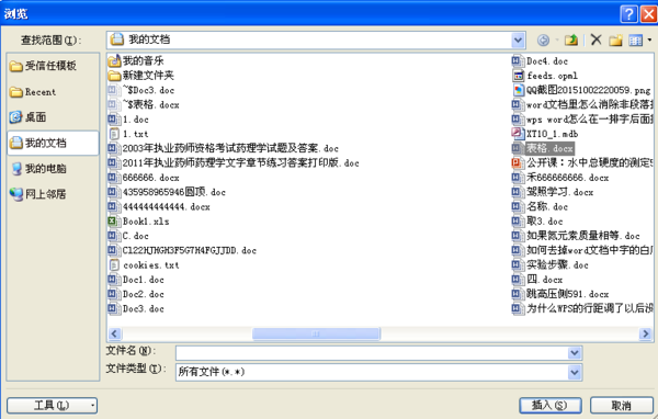 2、弹出插入文件对话框,选择所需要的文件名即可,如图所示。