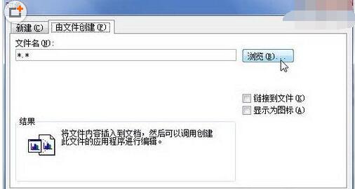 2,在打开的“对象”对话框中切换到“由文件创建”选项卡,然后单击“浏览”按钮