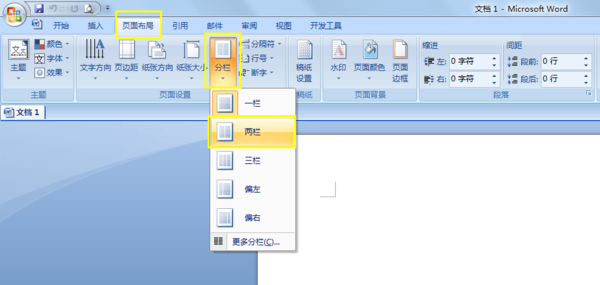 第二步:在页面布局中 设置“分栏”为“两栏”,如下图。
