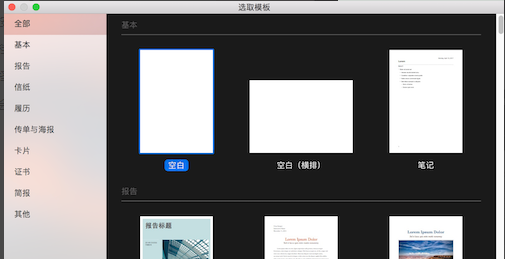 4.如果要在本地新建一个Word文档,可以进入Launchpad打开Pages应用,然后点击左下角的新建文稿按钮,它就会让你选择要新建哪种类型的文档,里面的样式很多,可以根据需要自由选择。选择好之后,点击右下角的选取按钮就会为你新建一个Word文档了。