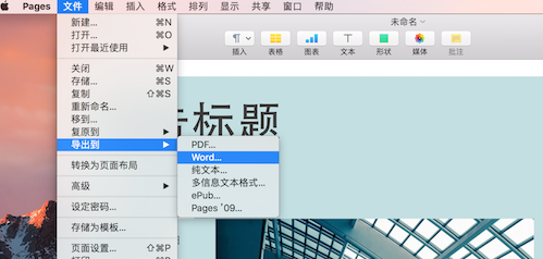 四、处理文档结束后,点击Mac系统左上角的菜单栏中的“文件”选项,然后把鼠标悬停在“导出到”选项上,最后在弹出的选项中选择“Word”选项。
