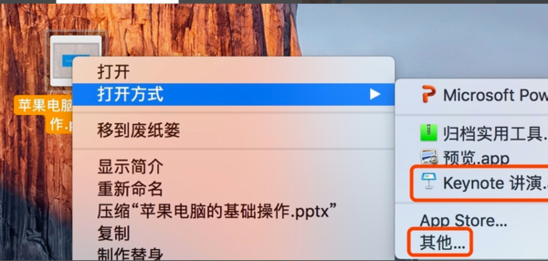 7.打开ppt其实很简单,你只要右键,选择keynote这个苹果自带的软件打开就可以了。