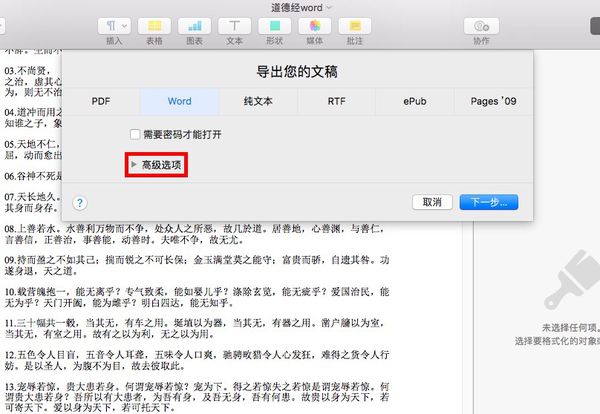 六、上一步点击后可以看到高级选项下出现了格式选项,选择后缀名为docx。点击“下一步”。