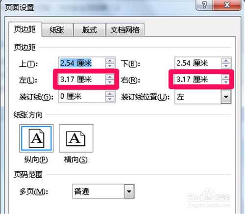 接着会弹出“页面设置”对话框,在“页边距”标签中,我们要修改“左右边距”,根据将要设置的图片的宽度大小,计算出左右边距大小。比如:我们要插入宽度为10厘米的图片,那么A4页面的左右边距就可以设为(21-10)/2,就是左右边距各为5.5厘米。设置完后点击“确定“。