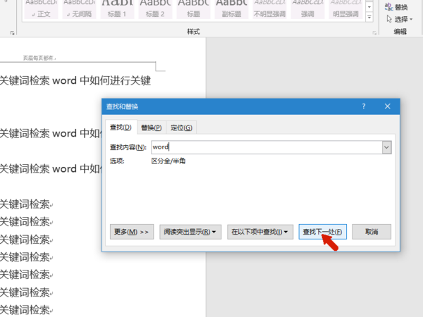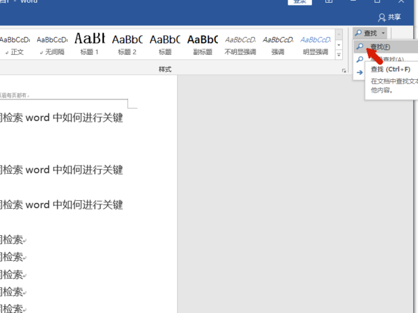 二、要搜索文档中的关键词,按快捷键ctrl+f ,输入你要查找的关键词 ,点搜索