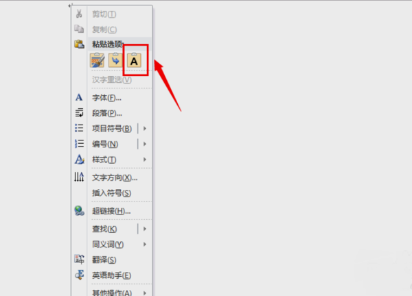 4、剪切完成后,再点击右键鼠标,在右键菜单中选择粘贴下的只保留文本图标点击。