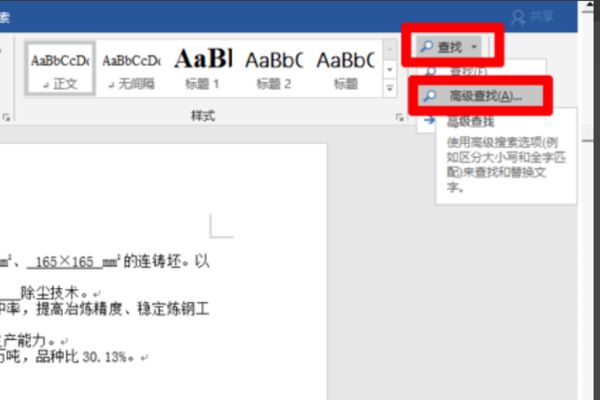 二、然后,在Word主界面上方点击“查找”中的“高级查找”选项点击打开。