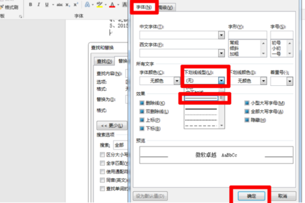 五、然后,在对话框中选择“下划线线型”类型和文中下划线一样的类型,然后“确定”保存设置。