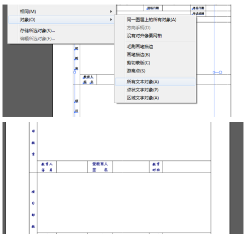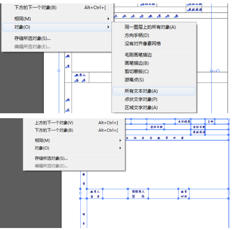 4.单击“选择(S)”——“对象(O)”——“所有文本对象(A)”,这样就自动选择好了所有的“文本对象”,然后就可以对所有的文字进行字体、字号及文字颜色进行调整;【注:文字颜色选“填充颜色”,而非“描边颜色”‘ 】如果需要更改部分文字,就选择对象下的区域文本对象,注意选择的时候尽量把文档放大些,鼠标容易选上。