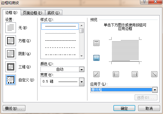 5、边框和底纹对话框,应用于修改为单元格,预览图中点击去掉顶部和俩侧线条,点击确定即可。