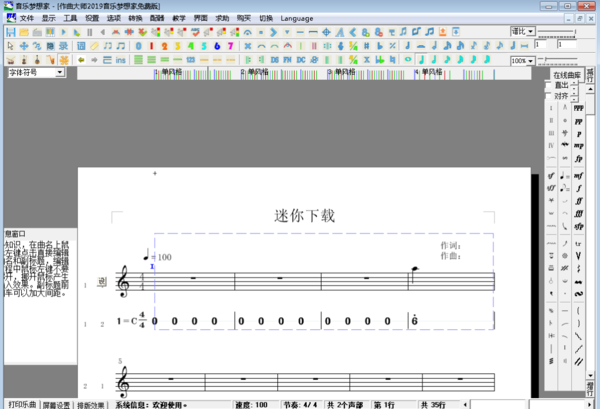 作曲大师2019是一款功能强大的作曲辅助软件,可以用来书写和打印五线谱和简谱(包括歌词),创作MIDI音乐,并使电脑具有电子琴的功能,用键盘弹奏音乐,支持128种音色和16声部交响乐的编辑,开创性的将中国人常用的简谱.五线谱.简谱鼓谱.简谱节奏谱.五线谱鼓谱进行同时处理,支持简谱和线谱以及鼓谱的混合排版和互换,支持A3、A4、16开版式的横排和竖排页面支持音符大小调整,当然值得考虑的.