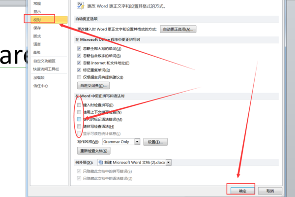3、在WORD选项的设置界面中点击左侧的“校对”,然后在右边找到“在WORD中更正拼写和语法”,取消下面全部选项的勾选状态,即去掉选项前面小方框里的勾,并点击界面右下角的“确定”按钮即可。