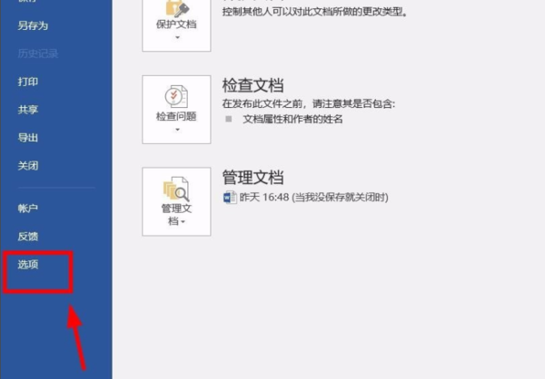2、在左侧导航栏找到并点击“选项”,进入WORD选项的设置界面。