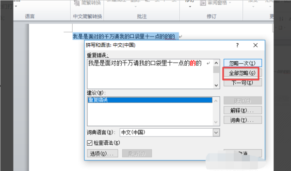 我们选择开始-审阅,在审阅菜单栏选择语法和拼写错误,如图所示